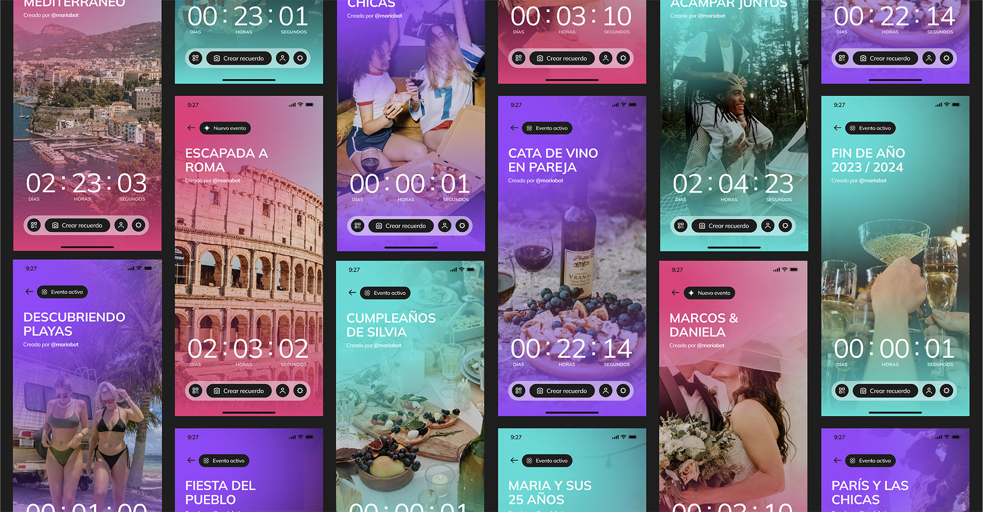 We were clear that the key was to create a simple and intuitive interface that also inspired users to naturally capture and share their memories. The first major decision was to focus on event creation as the main feature. We designed a flow where each event goes through various states — from inactive to active, countdown, and finally deactivated — to reflect the temporal lifecycle of memories (photos would be available for 30 days, encouraging downloads).