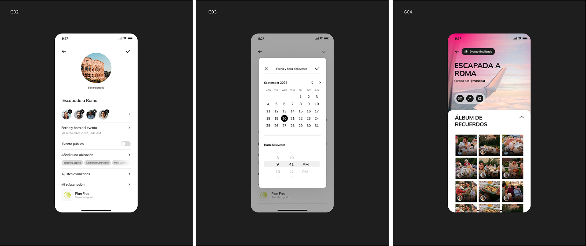 Since the app was not meant to be a traditional photo album, we faced the challenge of managing images dynamically by integrating features such as artificial intelligence that automatically reorganizes blurry or misplaced photos, ensuring the memory curation process is as smooth as possible. Additionally, users can take photos directly from the app or upload them later, providing flexibility. The app follows a freemium model, offering essential features like event creation and photo sharing for free, while advanced functions such as photo retouching and smart organization are unlocked with a subscription.